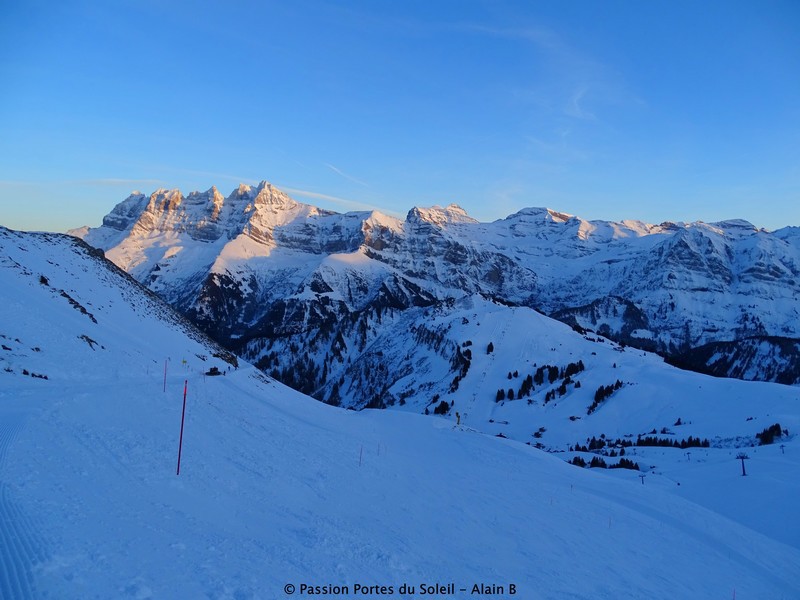 Couché de soleil sur les Dents du Midi et piste des Mossettes